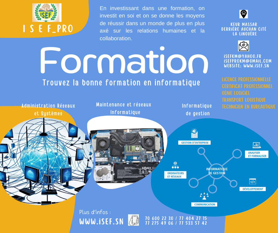 En informatique : Que vous soyez un particulier désireux de monter en compétences, un étudiant en quête de spécialisation, un professionnel en reconversion, ou une entreprise souhaitant former ses équipes, ISEF PRO propose des parcours adaptés à vos objectifs. Nos formations s’adressent à tous les niveaux, du grand débutant à l’expert souhaitant se perfectionner.